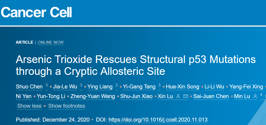 2020年12月24日,基因解碼科學(xué)家實現(xiàn)了突破,在 Cancer Cell雜志上發(fā)表了文章 Arsenic Trioxide Rescues Structural p53 Mutations through a Cryptic Allosteric Site,提出了針對抑癌蛋白設(shè)計和尋找靶向藥物的理論,并根據(jù)此理論,觀察并解釋老化合物三氧化二砷(ATO)可以恢復(fù)部分基因突變導(dǎo)致的P53蛋白缺陷,在國際上提出了根據(jù)抑癌蛋白腫瘤基因設(shè)計和選擇靶向藥物的方法和案例。