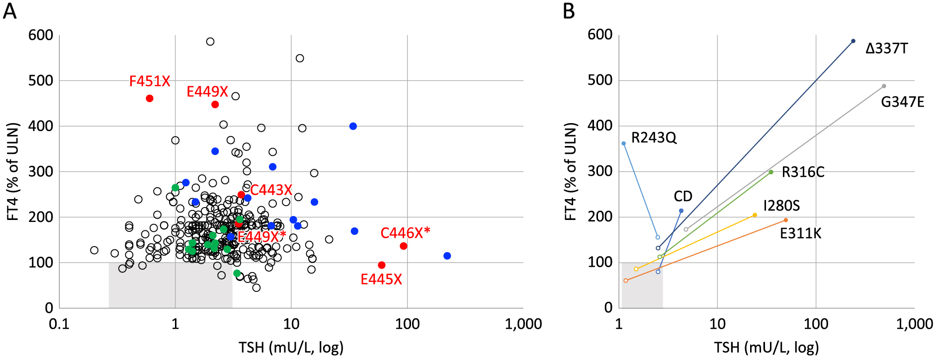 佳學(xué)基因甲狀腺激素抵抗全身性抵抗型基因檢測大數(shù)據(jù)分析的FT4值以各機(jī)構(gòu)參考范圍上限的百分比表示。(A)通過人工智能數(shù)據(jù)分析及認(rèn)知模型從案例中獲得了四種不同的單個(gè)氨基酸缺失(綠色圓圈),五種不同的早期終止密碼子(紅色圓圈)和六種不同的移碼突變(藍(lán)色圓圈),并與單個(gè)氨基酸缺失和單個(gè)氨基酸替代(開放圓圈)進(jìn)行了比較,這些數(shù)據(jù)是從佳學(xué)基因的案例集中分析得來。FT4值以其對(duì)應(yīng)的TSH先進(jìn)值(對(duì)數(shù)尺度)繪制,參考范圍用灰色方塊表示。帶有星號(hào)的兩個(gè)截?cái)嗤蛔兪褂每俆4值繪制。(B)通過人工智能認(rèn)知模型獲得了RTHβ的同卵突變患者(實(shí)心圓圈),其中包括一種單個(gè)氨基酸缺失(Δ337T),五種不同的單個(gè)氨基酸替代和一種有效缺失(外顯子4-10),并與異卵突變患者(開放圓圈)進(jìn)行了比較。CD表示有效缺失。