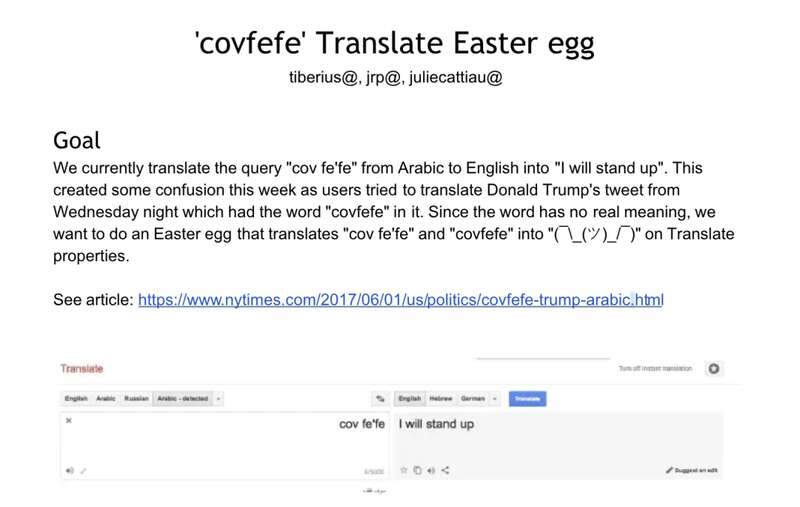 在一份被泄露的名為「covfefe Translate Easter egg」文件中,谷歌的工程師們甚至從阿拉伯語詞典中刪除了「covfefe」這個詞以及它的意思「I will stand up」,并用聳肩表情符號取而代之,以推進他們的反特朗普政治議程?!?/p>