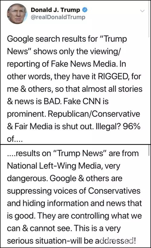 例如,2018年舉行的中期選舉時,特朗普推特上發(fā)言稱「在谷歌上搜索特朗普新聞時,出來的全是假新聞……谷歌和其他媒體都在壓制保守派的聲音,將正面新聞隱藏起來。這些科技公司正在控制人們可以看什么,不能看什么?!埂 ?/p>