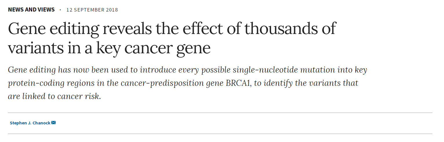 [4] Gene editing reveals the effect of thousands of variants in a key cancer gene, Retrieved September 12, 2018, from https://www.nature.com/articles/d41586-018-06022-y